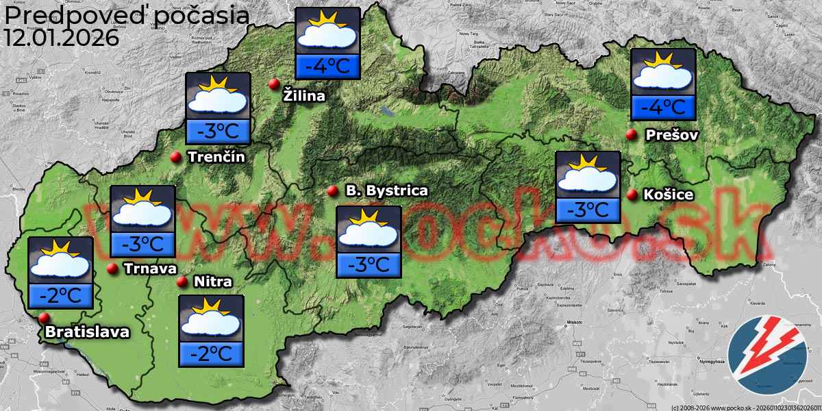 Na západnom Slovensku pozajtra očakávame prevažne oblačno a miestami prehánky. Najnižšie ranné teploty -8 až -11 °C a najvyššie denné teploty -5 až -2 °C.